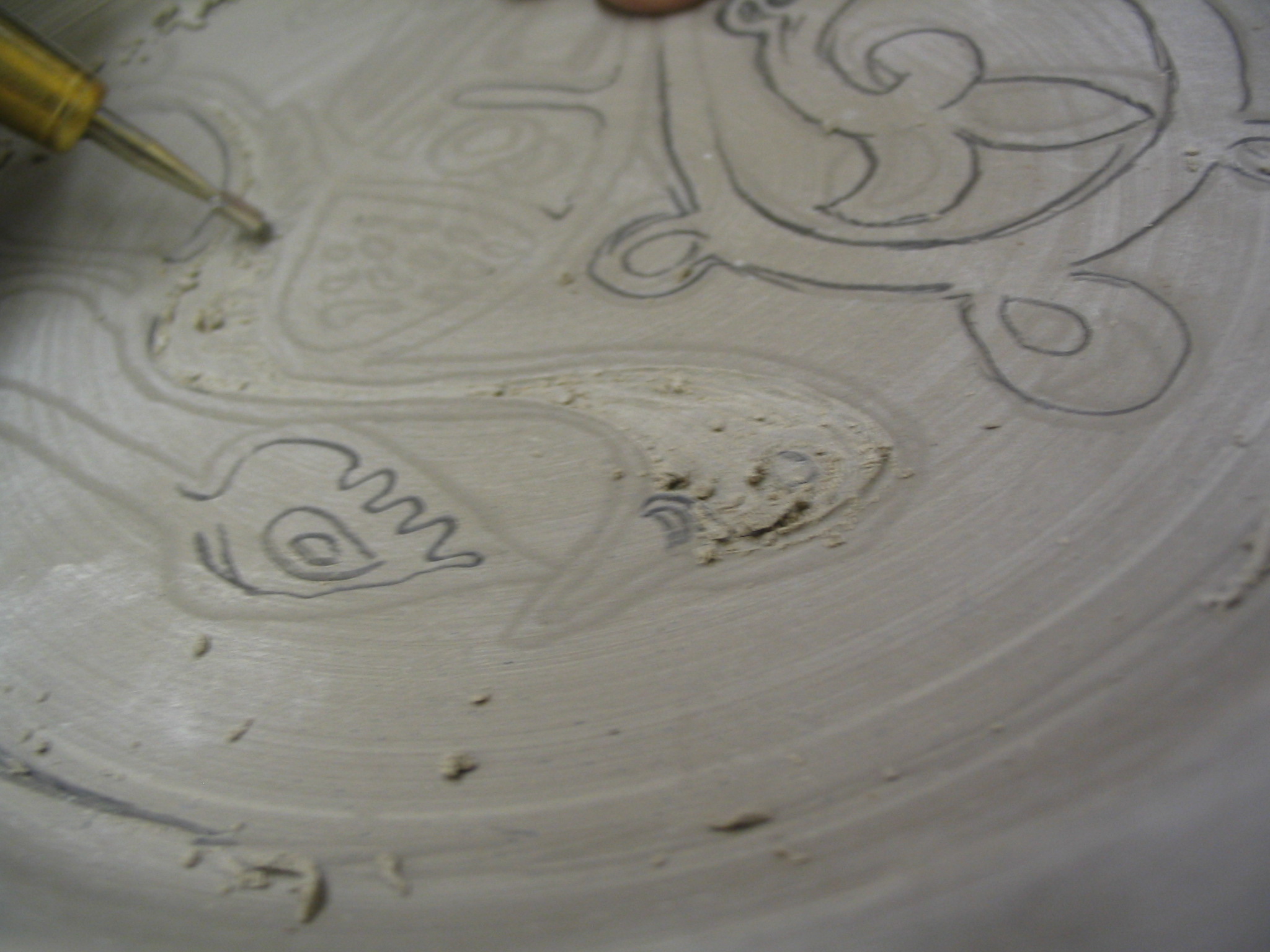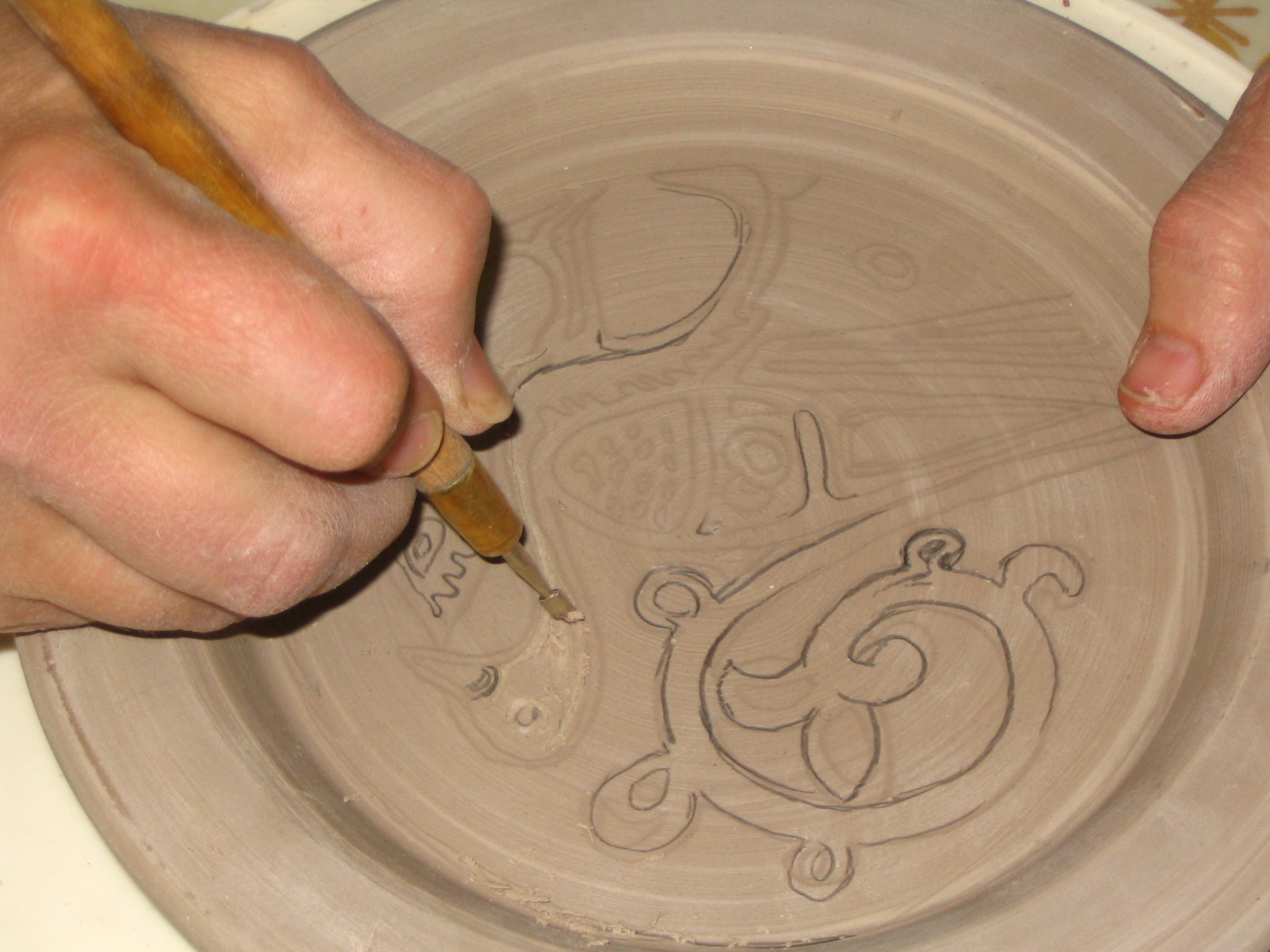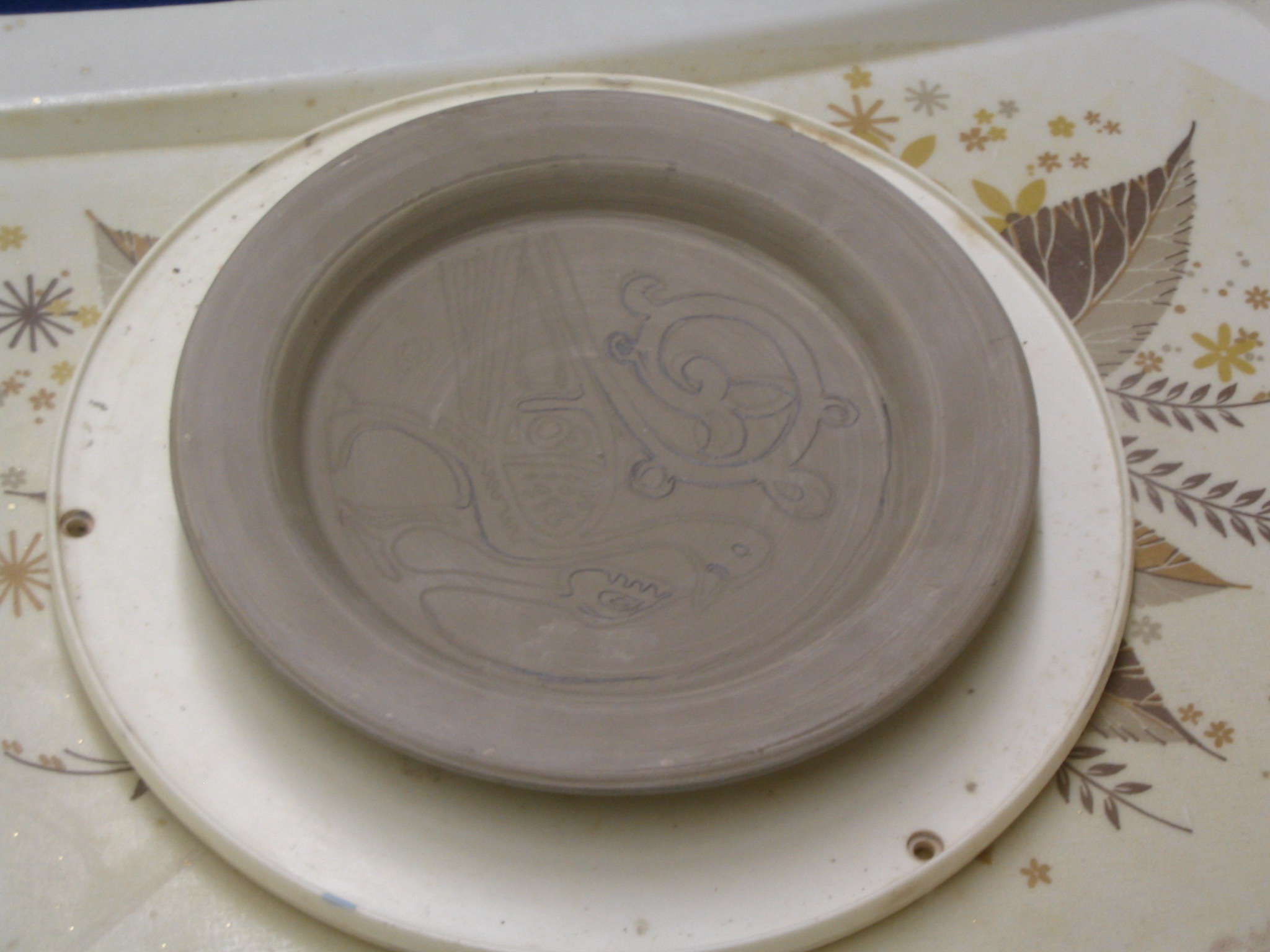 Carved plate before bisque fire