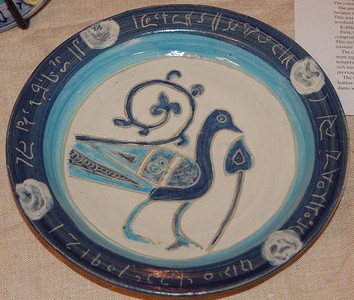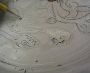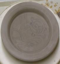 When the piece was completely dry, it was fired to the bisque stage. The design was then painted in using under-glazes and colored glazes. The piece was fired a second time to a higher temperature to melt and bond the glaze to the plate, and to vitrify the clay.